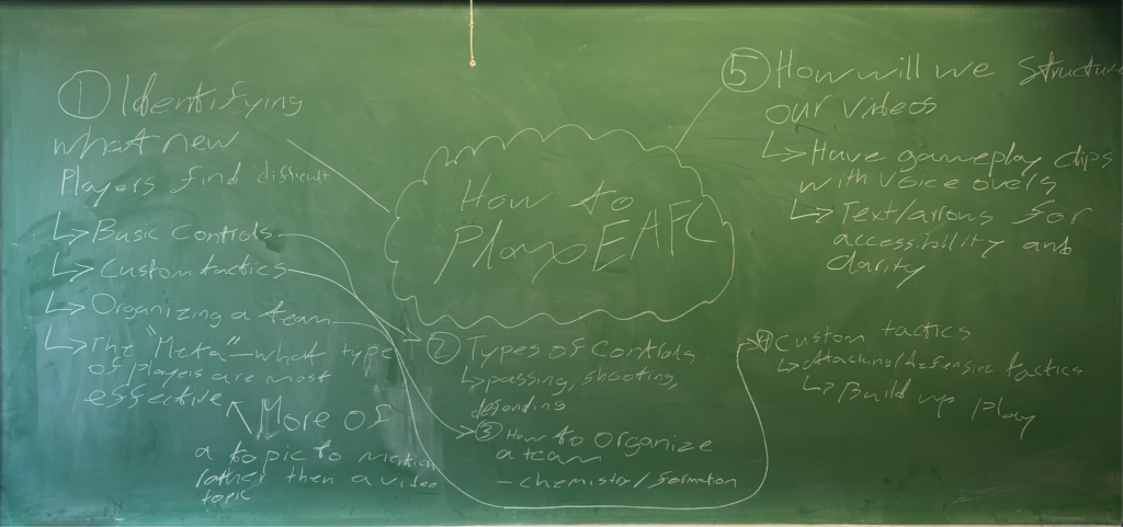 Our planning process began with a brainstorm, to determine what EAFC concepts we would like to teach to beginners and what would be the best way to get these points across in our videos. We discussed our own experience with the game while also asking others who play the game both competitively and casually. We came to the conclusion that most beginners struggle with controls, customizing their team, and applying strategy during matches. The brainstorm also includes our ideas on how we will structure our videos using gameplay clips, voice overs, text overlays and visual cues to enhance engagement.