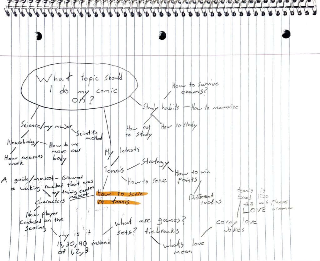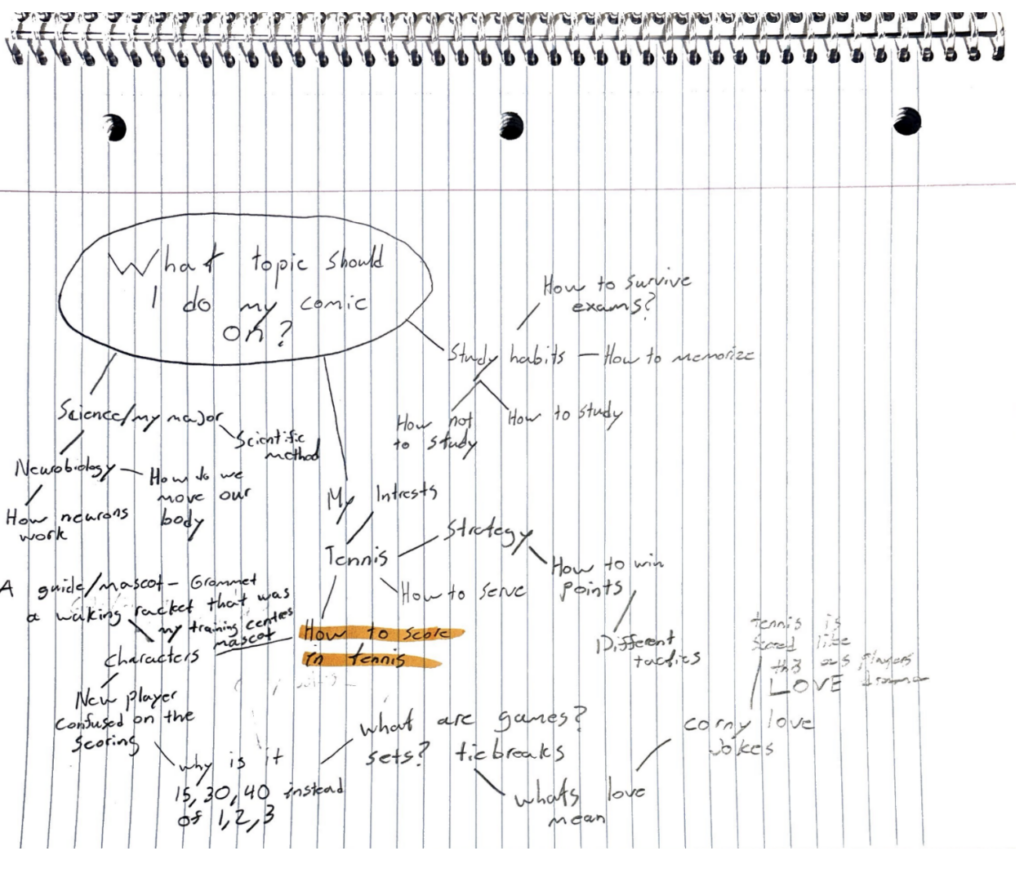 To begin my brainstorming, I created a mind map (above image) of any ideas surrounding my central question “what topic should I do my comic on?” From here I engaged with topics surrounding my major (neurobiology), study habits and other ideas around tennis. This helped me look at all my options while still surrounding myself with topics that interest me.