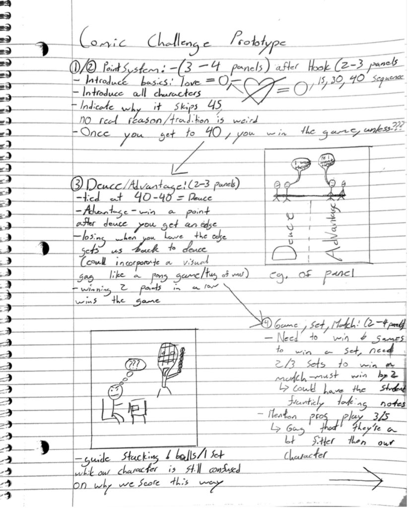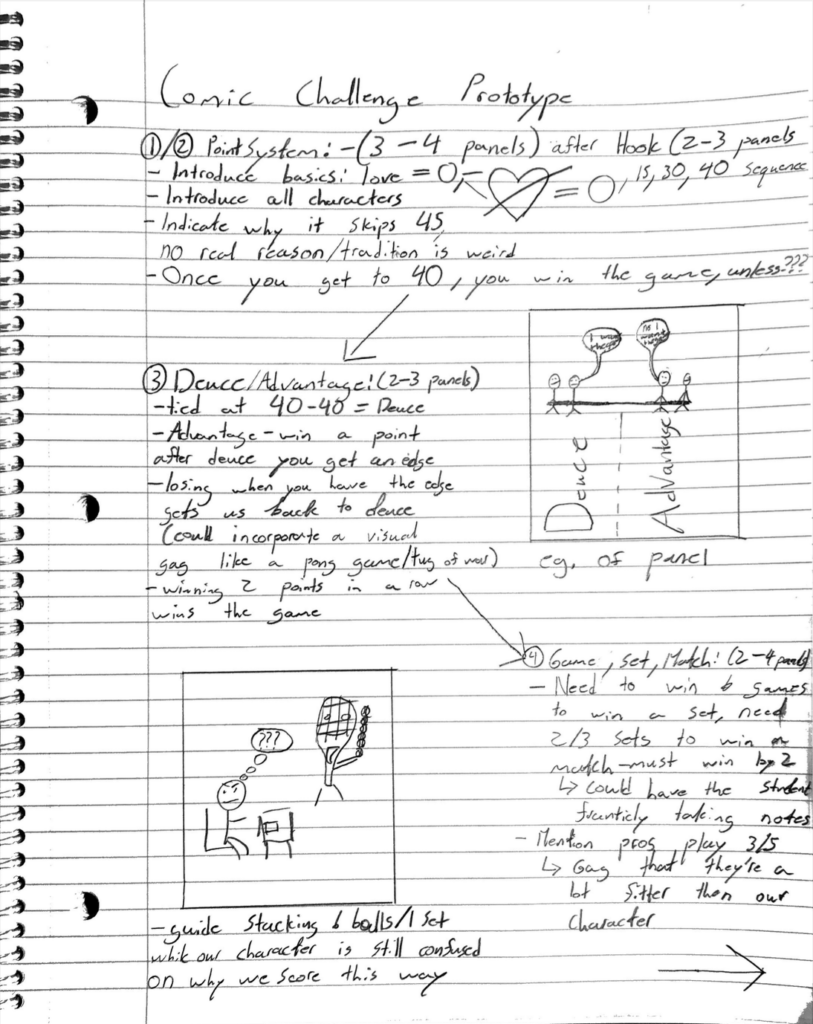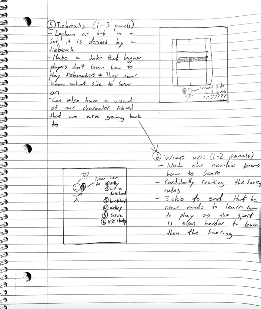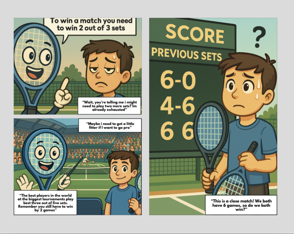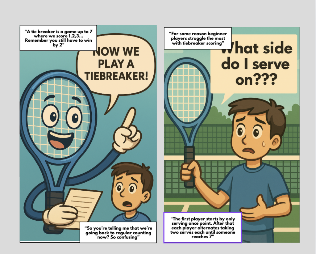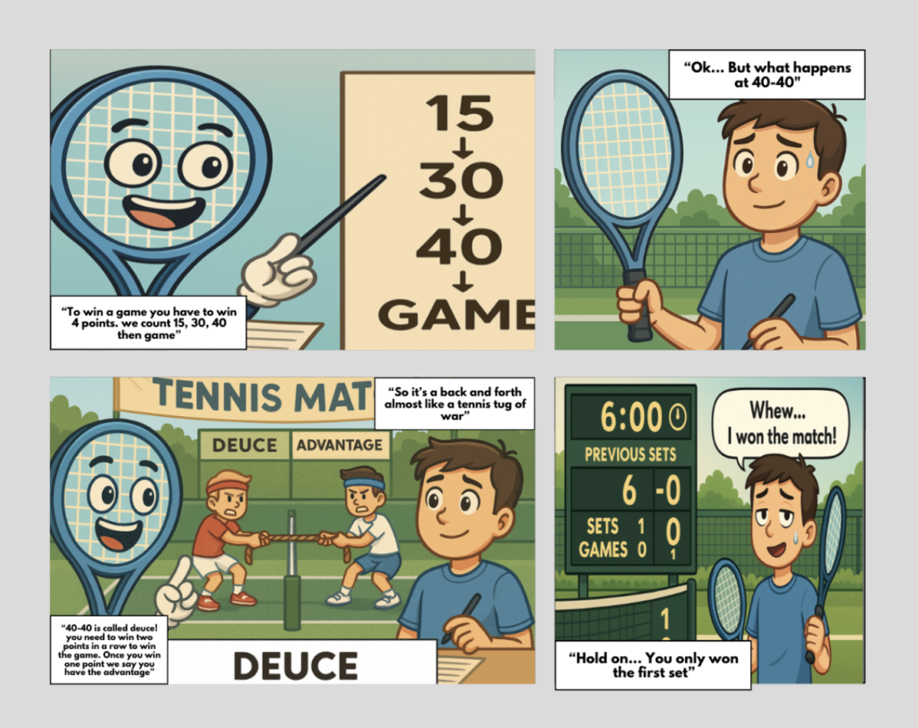 Demographically, the audience of this comic is broad spanning from youth athletes, recreational players and even sports fans who like watching tennis but don’t understand the rules. Although this comic is targeted to a wide range of people, I believe this form of learning best caters to young kids learning the game. Psychographically, the learners are motivated by curiosity and potentially have a desire to further understand the sport (to potentially fit in with a social group) or by improvement as they want to have a deeper understanding of scoring to better apply tactics. Behaviourally, these are hands-on learners who benefit from repetition, analogies, and seeing concepts applied in real-world game contexts.