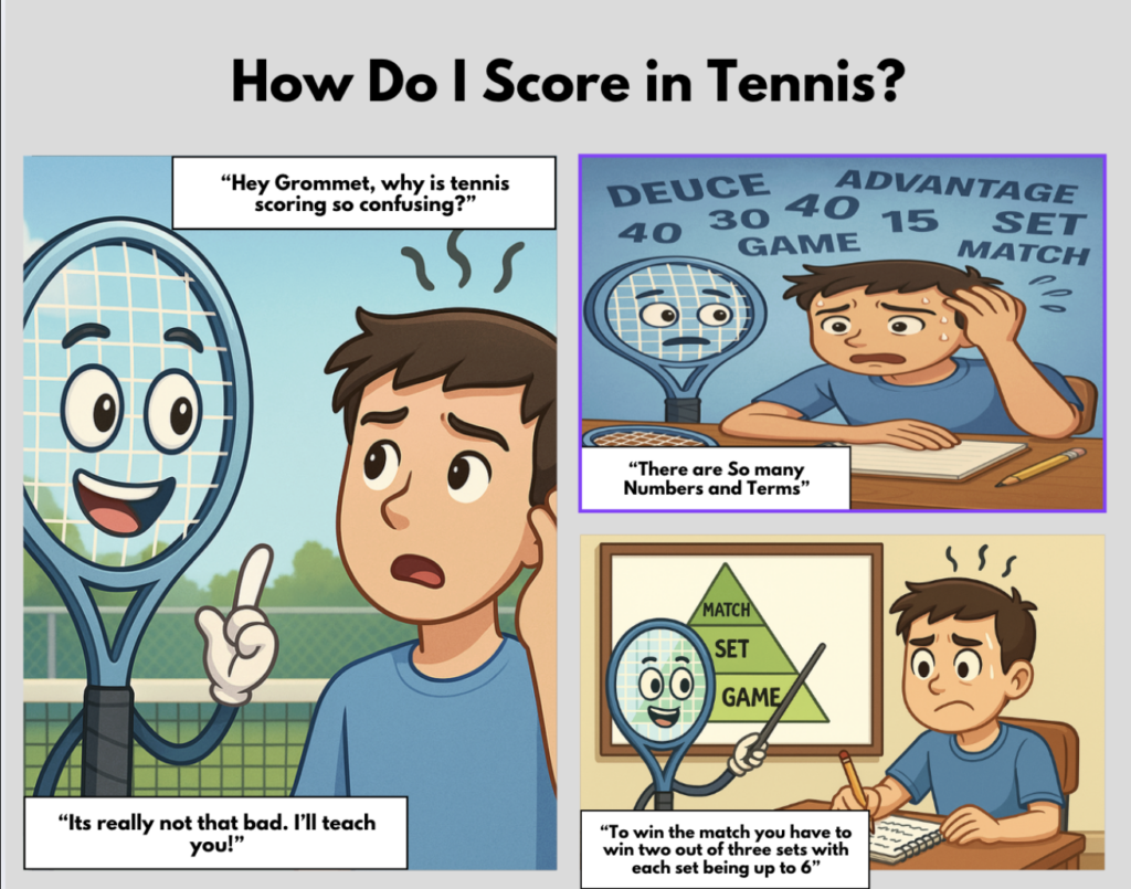 • Panel 1: A confused beginner tennis player stands on a court scratching his head. Dialogue: “Why does tennis scoring make no sense?”