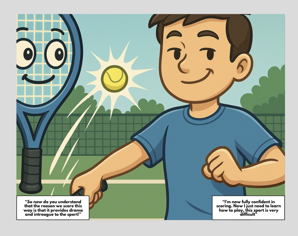 A beginner tennis player who feels overwhelmed by tennis’s confusing scoring system needs a simple, engaging and accessible explanation so that they can confidently follow and play in matches, while also recognizing that learning to play the sport itself will take further effort.